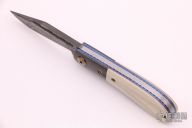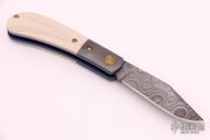 This Full Dress Backpocket with Lanny's Clip blade by Doc Shiffer features a Chad Nichols Damascus clip point blade with Fuller. The handle has carved zirconium bolsters, carved Westinghouse ivory paper micarta covers, anodized and fileworked titanium liners and a 52100 spring. Has half-stop, flush in all positions. Comes with original box and COA dated 6-6-21. New from maker.