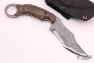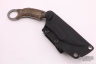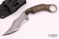 This Karambit by Kiku Matsuda features an acid etched blade with partially serrated top edge and notched thumbrest, .189" blade stock and 1.450" blade depth, full tang construction. The handle has black canvas micarta scales. Comes with kydex sheath with TekLok. Excellent condition.