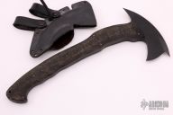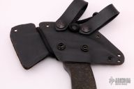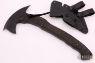 A collaboration between edged weapons expert Rafael Kayanan and Daniel Winkler. The goal was to exceed the standards of what a tomahawk could be- a practical application tool of exceptional craftsmanship. Despite its sleek appearance, the Sayoc-Winkler R&D Hawk is made with edge awareness, economy of motion and mobility in mind. Designed so that the heaviest area rests at the head, the hawk's full tang is milled to a taper reducing overall weight to an approximate 1 1/2 lbs. Black rubber handle featuring an upward curved end to reinforce grip, the handle is 13 inches long. Made from .380" stock. Has a few light scuffs, otherwise excellent condition. Comes with Kydex sheath. Has front spike.