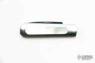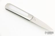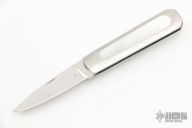 This Slipjoint by Eugene Shadley features a mirror polished blade with nail nick. The handle has polished stainless steel covers with mother-of-pearl inlays, stainless steel spring. Nice blade seating. Has some light scratches, otherwise good condition. #331 on the blade