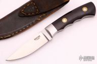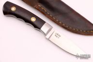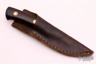 This knife by Charles Weiss features a satin finished blade with .161" blade stock and .812" blade depth, full tapered tang construction. The handle has integral stainless steel bolsters, cocobolo scales. Comes with a brown leather sheath. Has a few light scratches, otherwise excellent condition.