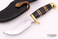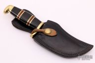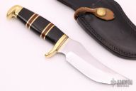 This knife by John Nelson Cooper features an upswept satin finished blade with notched thumbrest, .181" blade stock and 1.506" blade depth, hidden tang construction. The handle has brass guard and butt, stacked micarta and brass grip. Comes with a black leather sheath. Has some scratches otherwise good condition considering its age.