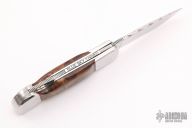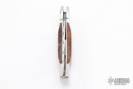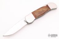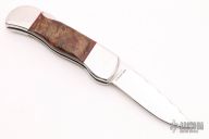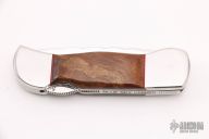 This Lockback by Blue Sky Knives features a mirror polished blade with fileworked spine and notched thumbrest. The handle has dovetailed stainless steel bolsters, wood scales with red spacers, stainless steel liners and fileworked backspacer. Has some scratches and light oxidation on the backspacer, blade is off center, has some gap between backspacer and liners, fair condition.
