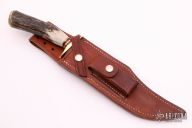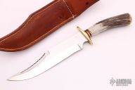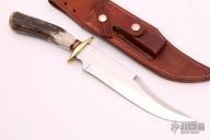 This Bowie by Jim Ort features a mirror finished blade with a serrated top edge, .186" blade stock and 1.587" blade depth, hidden tang construction. The handle has a brass guard and butt, stag grip with black/red/brass spacers. Comes with a brown leather sheath. Has some light scratches, otherwise excellent condition.