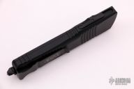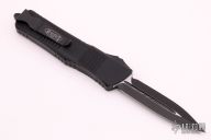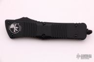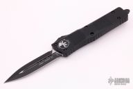 This Combat Troodon OTF automatic by Microtech knives features a black double-edged double blade, and a black aluminum handle with black hardware, tip down carry. Glass breaker. S/N 32232. Dated 02/2021. Comes with a Microtech box and papers. Comes with a black nylon Microtech belt sheath. Excellent condition.