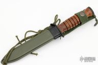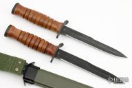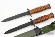 This 65th Anniversary issue of the 1943 M3 is made with the same mark used in 1943, now owned by the original H. Böker in Germany. The blade of SK-5 high-carbon steel at 57-59 Rc. measures 6-11/16" x 7/8" and has the same black coating. The stacked leather handle and the M8A1 metal sheath are true reproductions of the original. Measures 11-5/8" overall and weighs 8.8 oz. Sheath made in Germany, the knife in China. Suggested retail is $144.95. This package comes with 2 US m3 Fighting knives, serial numbers 2475 and 1254. It comes with one original sheath. Both knives have some scuffs on the blade, otherwise excellent condition.