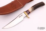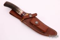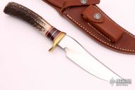 The Model 27 is an ideal all-around heavy-duty sportsman's knife. This knife has a satin finished blade with .200" blade stock and 1.345" blade depth, hidden tang construction. The handle has a brass guard and butt, stag grip with red/brass/white/maroon linen micarta/black/duralumin spacers. Comes with a brown leather sheath. Excellent condition.