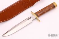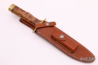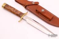 The Model 1 was made famous by Allied combat troops in World War II and has since been widely used in all theaters of war. .197" blade stock. 1.110" blade depth, satin finish blade with sharpened top edge, carbon steel. Brass guard, maple burl grip with black/brass spacers, and a brass butt cap. Includes brown leather sheath. Excellent condition.