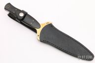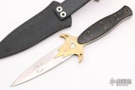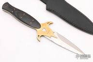 This King of Hearts dagger by Frost Cutlery features a satin finished double edged blade, .152" blade stock and 1.125" blade depth, full tang construction. The handle has brass bolsters/liners, and dymondwood scales. Comes with original black leather sheath. Excellent condition.