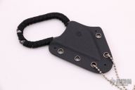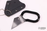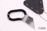 This Tiger Striped Straight by Hideaway Knives features a tiger striped wharncliffe blade with notched thumbrest and cord wrapped grip, .131" blade stock and 1.073" blade depth, full tang construction. Comes with a kydex neck sheath and original packaging. New from maker.