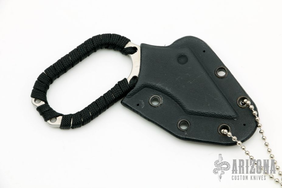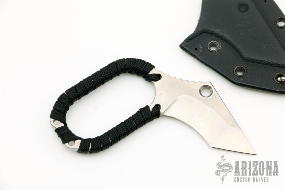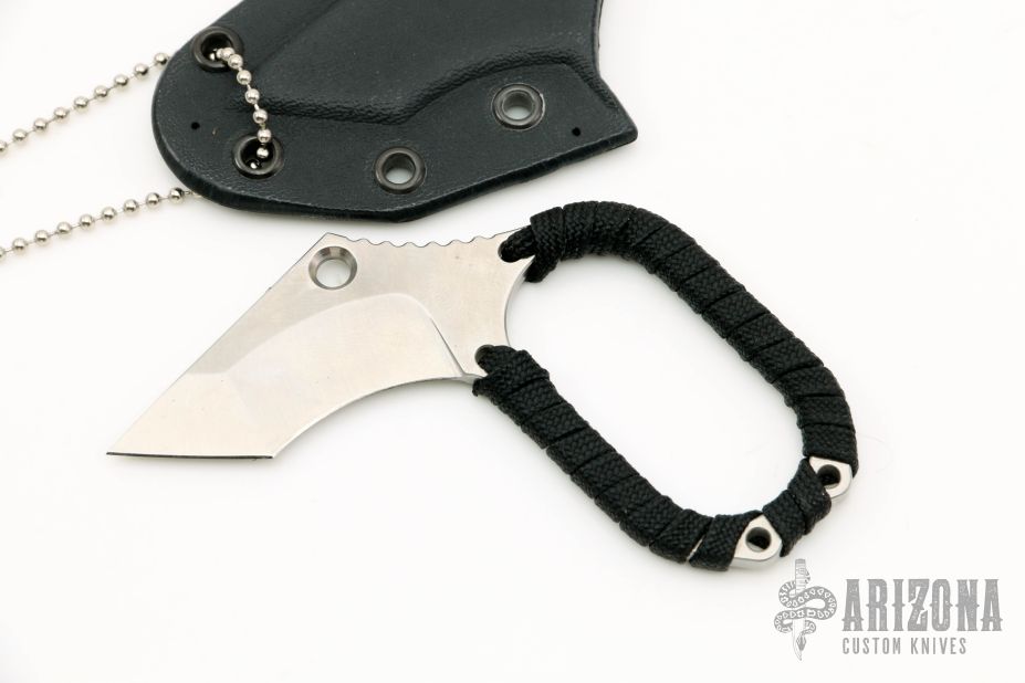 This Polished Hybrid by Hideaway Knives features a satin finished tanto recurve blade with notched thumbrest and cord wrapped grip, .130" blade stock and 1.010" blade depth, full tang construction. Comes with a kydex neck sheath and original packaging. New from maker.