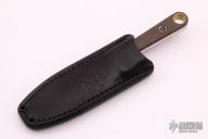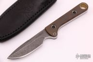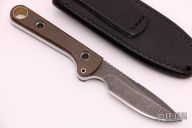 This knife by Vehement Knives features a tumbled spear point blade with a notched thumbrest and a full tang construction. .187" Blade Stock.  .832" Blade Depth.  The handle features green micarta scales and hollow tube pins.  Includes a black leather sheath.  Includes original box and papers.  Dated June 2nd 2017.  Excellent Condition.