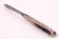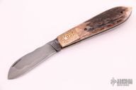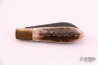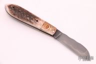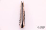 This Spit Fire Jack by Excelsior Knife Co was made by Chuck Hawes and is 1 of 25. It features a hand rub satin finished blade with nice hamon, fileworked spine and nail nick. The handle has Mike Sakmar 3-alloy mokume, genuine stag covers, stainless steel liners and a fileworked W2 spring. Has half-stop, flush in all positions. Comes with original box and COA dated May 29, 2019. Excellent condition.