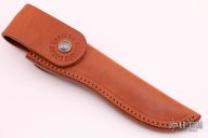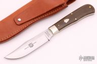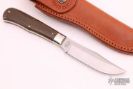 This knife by Great Eastern Cutlery features a satin finished blade with .125" blade stock and 1.042" blade depth, full tang construction. The handle has nickel silver bolsters, OD green canvas micarta scales and brass liners. Comes with a brown leather sheath and original packaging. Excellent condition.