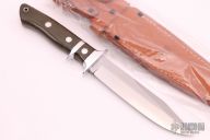 This Smoke Jumper Sub-Hilt from Bark River Knives features a clip point satin finish blade with false top edge, .186" blade stock and 1.117" blade depth, mortise/hidden tang construction. The handle has an aluminum guard and sub-hilt with green canvas micarta grip. Lanyard hole and lanyard in pommel. Includes original packaging and leather sheath. Excellent condition.