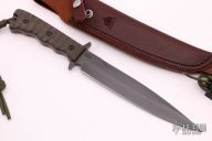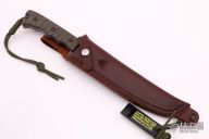 This Wild Pig Hunter by Tops Knives features a "black river wash" finished blade with false top edge, .245" blade stock and 1.309" blade depth, full tang construction. The handle has green canvas micarta scales with red liners. Comes with brown leather sheath and original papers. Excellent condition.
