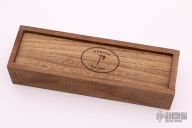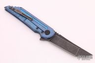 This Kwaiback from Jake Hoback was customized by Phil "The Preacher" Wozniak, it has a black stonewashed upswept/tanto blade, notched thumb-rest and flipper. CBP caged bearing pivot. Handle is titanium with a dimple and anodized finish, titanium barrel spacers and tumbled clip, tip up carry reversible, left or right. This knife has an adjustable detent. Nice lockup, and blade seating, flips like a boss. Includes original wooden box. Excellent condition.