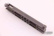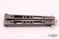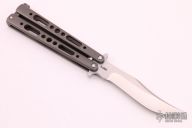 This Balisong by Mauricio Dobruski features a satin finished blade. The handles are bead blasted and channel construction titanium with a matching T-latch. Comes with zippered case and COA dated 05/2020. Excellent condition. #238