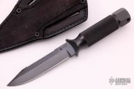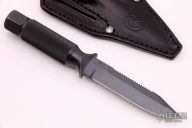 This knife has a false top edge and sawteeth, .188" blade stock and .865" blade depth, integral construction with hollow handle. Comes with original black leather sheath. #497 on the blade. Scuffs/scratches are visible on the blade and handle, fair condition.