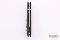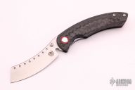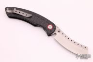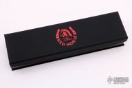 The Red Horse Knife Works Hell Razor P features a satin finished blade with dual thumbstuds and a notched thumbrest. The handle has carbon fiber scales with red G-10 pivot collars, inlaid stainless steel liners, tip up bead blasted titanium clip. Comes with original box. New from maker at the 2021 Blade Show.