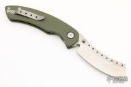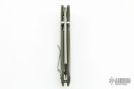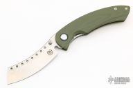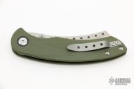 The Red Horse Knife Works Hell Razor P features a satin finished blade with dual thumbstuds and a notched thumbrest. The handle has green G-10 scales with black G-10 pivot collars, inlaid stainless steel liners, tip up bead blasted titanium clip. Comes with original box. New from maker at the 2021 Blade Show.