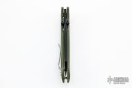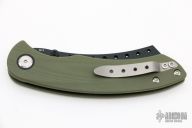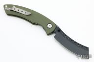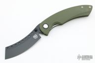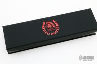 The Red Horse Knife Works Hell Razor P features a black PVD finished blade with dual thumbstuds and a notched thumbrest. The handle has green G-10 scales with black G-10 pivot collars, inlaid stainless steel liners, tip up bead blasted titanium clip. Comes with original box. New from maker at the 2021 Blade Show.