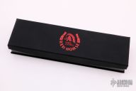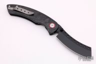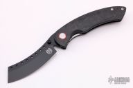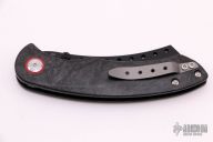 The Red Horse Knife Works Hell Razor P features a black PVD finished blade with dual thumbstuds and a notched thumbrest. The handle has marble carbon fiber scales with red G-10 pivot collars, inlaid stainless steel liners, tip up bead blasted titanium clip. Comes with original box. New from maker at the 2021 Blade Show.