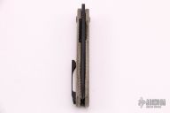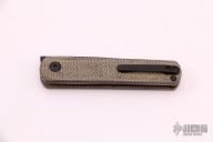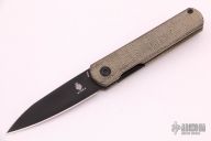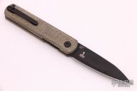 This Feist from Kizer was designed by Justin Lundquist. It features a black blade with front flipper. The handle is comprised of green canvas micarta with a black titanium tip up clip. Excellent condition. Comes with a velcro case.