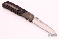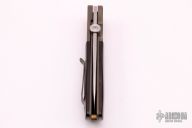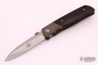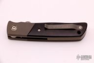 This TTF-5 from Bob Terzuola features a drop point blade with swedge and a knurled thumb disc.  The handle is composed of anodized and bead blasted titanium bolsters and liners, desert ironwood scales, anodized titanium backspacer, pocket clip is titanium and is positioned for tip up carry. Light scuffs are visible on the blade otherwise the knife is in excellent condition.