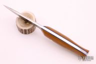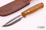 This knife by Night Watch Knives features a satin finished spear point blade with fullers, .195" blade stock and 1.119" blade depth, full tang construction. The handle has natural linen micarta scales with blue liners, brass pins and lanyard hole. Comes with a brown leather sheath and original box. Excellent condition.