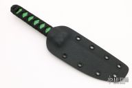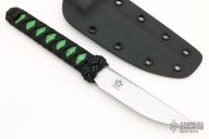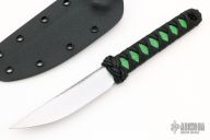 This Fixed Blade by Josh Mason features a hand rub satin finished blade, .131" blade stock, .975" blade depth with full tang construction. The handle has a Turk's head knot as a guard, and a wrapped handle over green stingray skin. Comes with a Kydex sheath. New from maker.