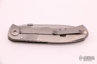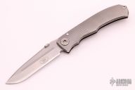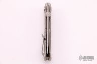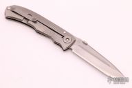 This Mid-Tech by Bob Terzuola was produced by Three Rivers Manufacturing, it features a drop point stonewashed blade with fullers, notched thumbrest and thumbdisc. The handle has a tumbled titanium frame with a matching tip up clip, carbon fiber backspacer, lanyard pin at the butt. Nice detent, lockup and blade seating.  Includes a padded zippered case.  Excellent condition.