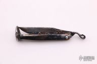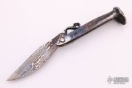 This Friction Folder by Master Smith Raymond Rybar features a Damascus blade. The handle is a railroad spike. Excellent condition.