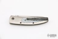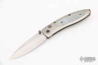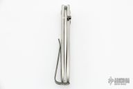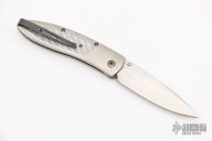 This Monarch Steam by William Henry features a hand rub satin finished San Mai blade with ZDP-189 core, single thumbstud with a corundum sapphires inset, matching button lock. The handle has an orange peel finished titanium frame with silver twill inlays with black screws and tip up clip. comes with original box and COA dated Dec 13, 2016. Excellent condition.