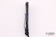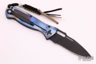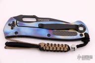 This Level III Folder from Combat Elite Inc. features a black partially serrated drop point blade with swedge and dual thumb studs. The handle is comprised of a heat colored titanium frame with carbon fiber inlays, black stainless steel tip up/tip down clip. Lanyard hole with lanyard in pommel. Excellent condition.