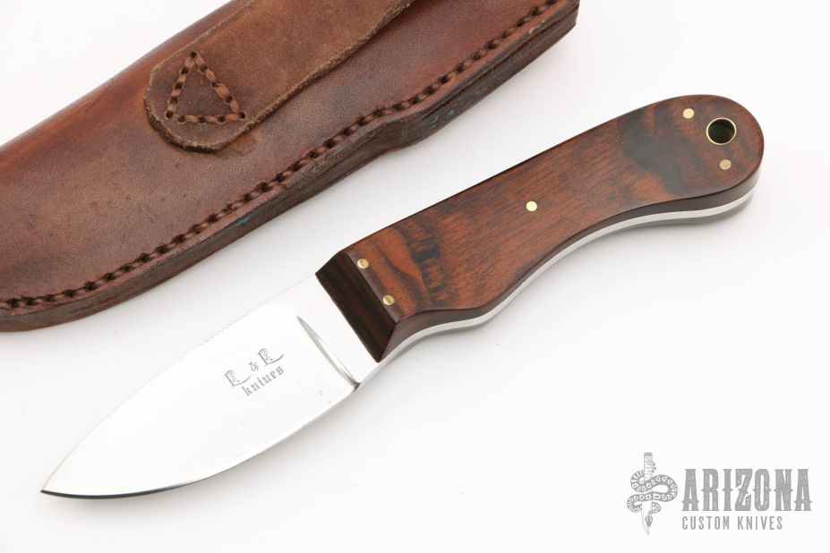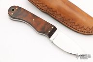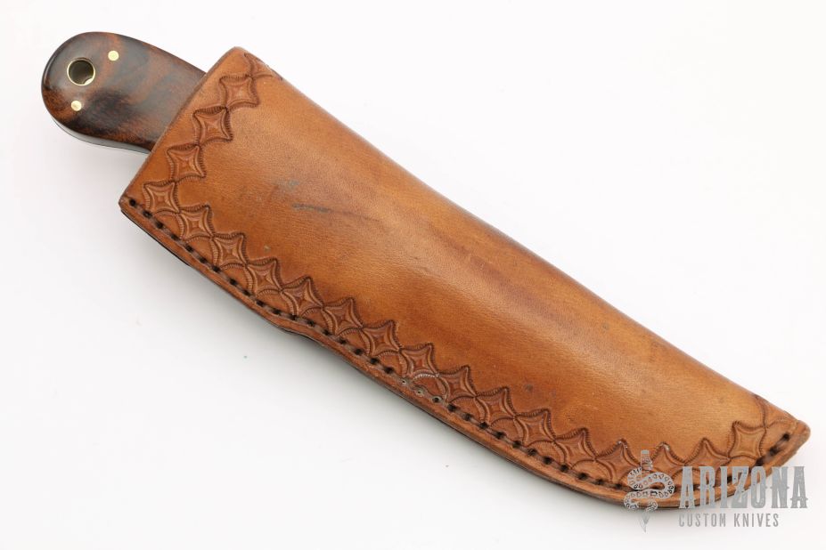 This knife by L&L Knives features a polished drop point blade with notched thumbrest, .113" blade stock and 1.147" blade depth, full tang construction with wood scales and brass pins. Comes with a hand tooled brown leather sheath. Excellent condition.