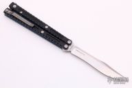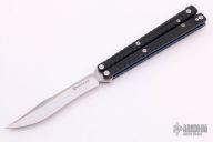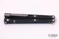 This Obsidian Balisong by Maxace features a satin finished blade. The handles have carved G-10 scales with anodized titanium liners and a titanium spring latch. Comes with original box and zippered case. New from maker. Blade steel: 14C28N