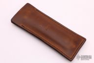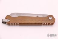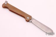 This Cracker Slipjoint by Jon Graham features a tumble finished blade with notched thumbrest. The handle has an integral copper frame with internal stainless steel spring and titanium lanyard bail. Comes with a brown leather slip sheath. Excellent condition.