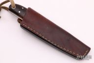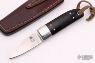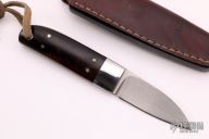 This custom fixed blade by Tom Mayo features a hand rub satin finished blade with .126" blade stock and .827" blade depth, full tang construction. The handle has stainless steel bolsters with cocobolo scales. Comes with a brown leather sheath. Has some light scratches, otherwise excellent condition.