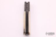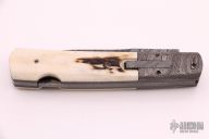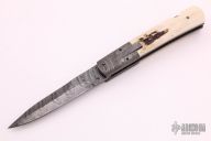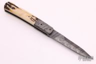 This custom auto by Burn Knives features a twist Damascus spear point blade with false top edge, Damascus bolster, button release, and liners. Blued carbon steel spring and back-spacer. Genuine India sambar stag scales. Lightning quick action. Perfect lockup and seating. Very nice piece. Excellent condition. Comes with a zippered case.