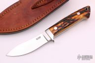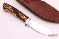 This Loveless Style Nessmuk by Mitch Jenkins features a mirror polished blade, mirror polished stainless steel fittings, and amber stag scales with red liners, .163" blade thickness and 1" blade depth, full tapered tang. Excellent fit and finish. Comes with brown leather sheath. Excellent condition.