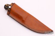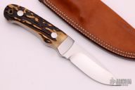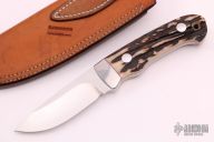 This hunter by Herman Schneider features a hand rubbed satin finish blade with .183" blade stock, 1.135" blade depth, full tapered tang construction. The handle has satin finish stainless steel dovetailed bolsters and stag scales with red liners. Great feel in hand. Outstanding work. Comes with a brown leather sheath. Excellent condition. "H.J. Sneider - Maker" on the tang.