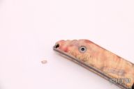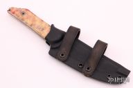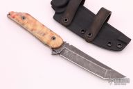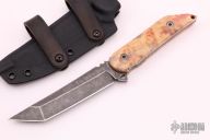 This Fixed Blade Kwaiback by Jake Hoback features a black stonewashed tanto blade with notched thumbrest, .189" blade stock and 1.105" blade depth, full tang construction with custom box elder burl wood scales, comes with original carbon fiber scales. Comes with a kydex sheath with leather belt loops. Very small chip on end of scale, as seen in photo. Other than that excellent condition.