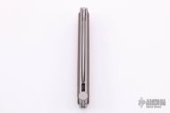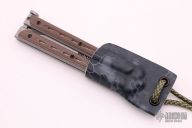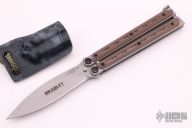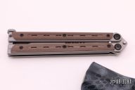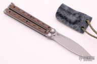 This Kimura 9 Balisong by Bradley Cutlery has a bead blasted drop point blade. The handles are bead blasted stainless steel with brown G-10 overlays, T-latch at the butt. Latch can be reversed. Comes with original box, papers and custom kydex neck sheath. Has some scuffs, otherwise good condition.