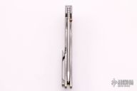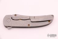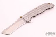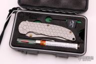 This Norseman (#4367) by John Grimsmo features a tumbled blade with a single anodized titanium thumb stud, notched thumb ramp and flipper. Stonewashed titanium frame with a honeycomb pattern front scale and anodized titanium screws. Very smooth action that requires no wrist movement. Nice detent, lockup and blade seating. Rides on ceramic bearings. Knife is in excellent condition, shows no signs of use or carry. Comes with original hard case and COA dated 12-15-2020