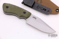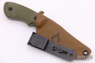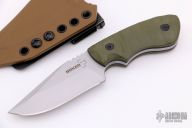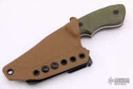 This Ridgeback by Boker is a Bill Coye design, it features a bead blast finished blade with blade thickness of .150" and blade depth of 1.300". Great feel in the hand. Handle has sculpted green G-10 scales with black liners. Includes kydex sheath with Ulti-Clip. Excellent condition.