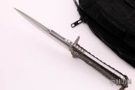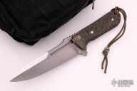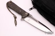 This fighter by Steve Ryan features a satin finished blade with fullers and notched thumbrest, .253" blade stock and 1.893" blade depth, full tang construction. The handle has a custom sculpted titanium guard, sculpted black canvas micarta scales and a textured tang. Comes with a kydex sheath with custom leg rig bag. Has some sheath scratches, otherwise excellent condition.