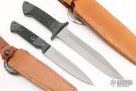 This Ghost Recon by Jim Hammond features a bead blast finish double edged blade with .159" blade stock. 1.214" blade depth, full tapered tang construction with black serrated linen micarta scales. Comes with brown leather sheath. Excellent condition.
