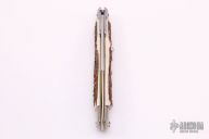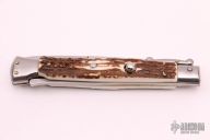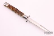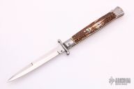 This 11" Swing Guard Auto by Frank Beltrame features a polished dagger/bayonet ground blade with false top edge. The handle has stainless steel bolsters, front and rear, Stag scales, brass liners, stainless spring. Has some light scratches, otherwise excellent condition.