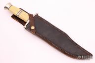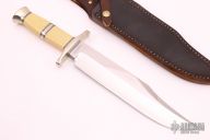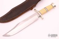 This large Draper style Bowie by Steve Voorhis features a mirror polished clip point blade with sharpened top edge, .237" blade stock, 1.998" blade depth. Hidden tang construction, with nickel silver guard and pommel, nickel silver, aluminum, and black spacers, and ivory paper micarta handle. Great feel in hand. Excellent condition. Comes with leather sheath.